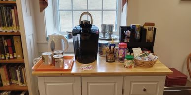 Often, we will have patrons come and meet in front of the fireplace. Please help yourself to tea or coffee from the Coffee Cart in the Parlor. Donations of tea and coffee cups are always welcome!